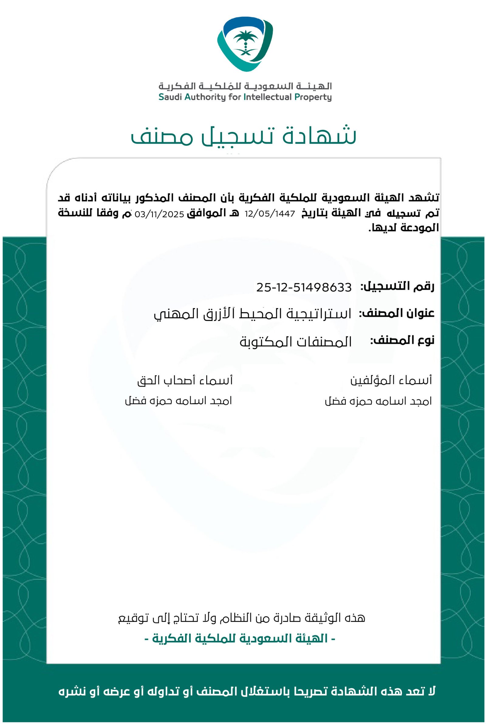 المحيط الأزرق المهني هي استراتيجية مبتكرة قمت بتطويرها لتكون خارطة متكاملة لبناء مسار مهني فريد ومطلوب. تتيح هذه الاستراتيجية للأفراد تحديد الفرص النادرة في سوق العمل، وتعزيز هويتهم المهنية بطريقة واضحة ومؤثرة، مع التركيز على استغلال خبراتهم ومهاراتهم بأفضل شكل ممكن. كما توفر رؤية شاملة تساعد على اتخاذ قرارات مهنية مدروسة، وتمكن الأفراد من التميز والاحتفاظ بمكانة قوية في بيئة تنافسية، ما يجعلهم الخيار الأول في أي فرصة مهنية مستهدفة.